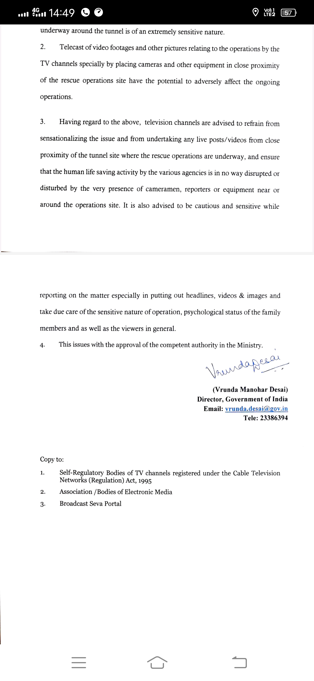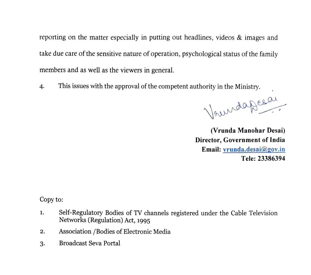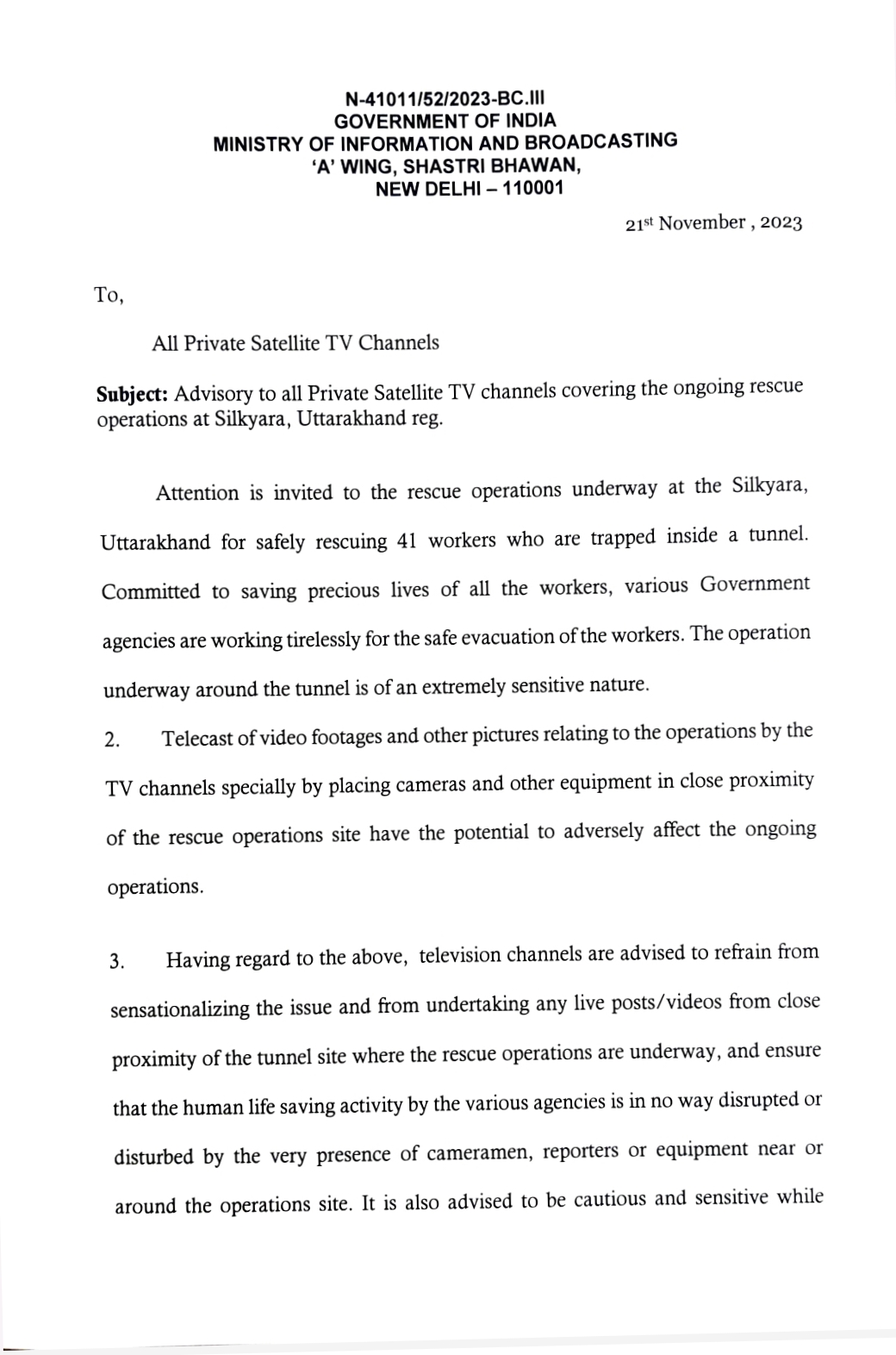उत्तराखंड के उत्तरकाशी जिले में सिलक्यारा टनल में फंसे 41 मजदूरों को निकालने की कवायद लगातार जारी है। इस बीच राहत और बचाव के साथ अच्छी खबर भी आ रही है। सूचना एवं प्रसारण मंत्रालय ने उत्तराखंड के सुरंग में फंसे 41 मजदूरों की घटना की रिपोर्टिंग करने वाले टीवी चैनल के लिए एडवाइजरी जारी की है। मंत्रालय ने सलाह दी है कि